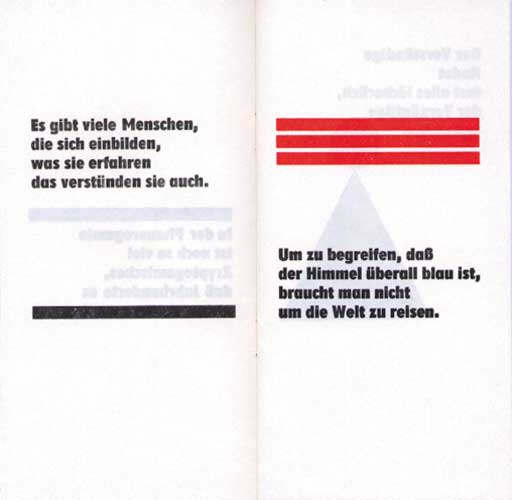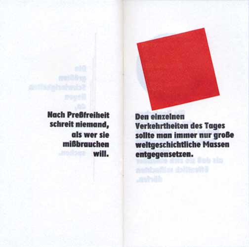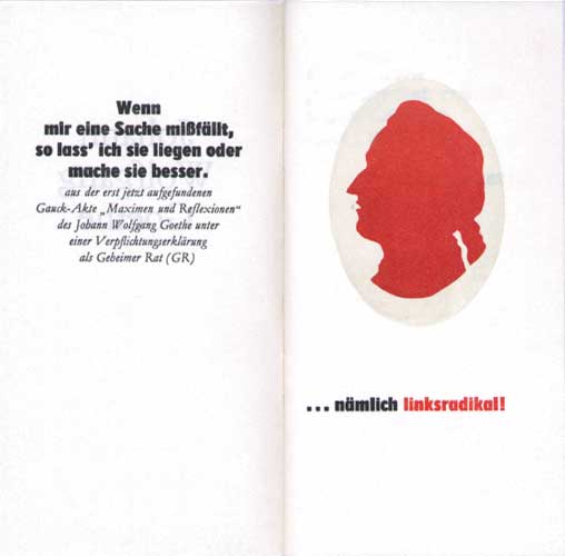 Jöthe wollte der Schwarzdrucker schon immer mal machen und das Goethejahr 1999 war Anlaß genug. Weil die ausgewählten Texte aus den „Maximen und Reflexionen“ auf eine gewisse Linksradikalität des Autors schließen ließ, bot sich altrevolutionäre „Bauhaus“-Typographie geradezu an. Als dieses Heft dann – Jahre später – endlich vergriffen war, folgte die digitale Erweiterung dieses Gedankens im frechen Heft „Goethe linksradikal“ mit anderen Mitteln, aber denselben Texten.