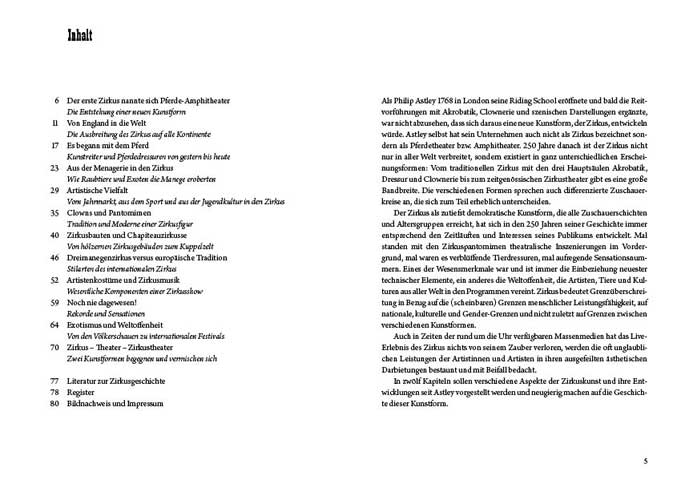 In zwölf Kapiteln werden verschiedene Aspekte der Zirkuskunst und ihre Entwicklungen seit Astley vorgestellt und sollen neugierig machen auf die Geschichte dieser Kunstform.