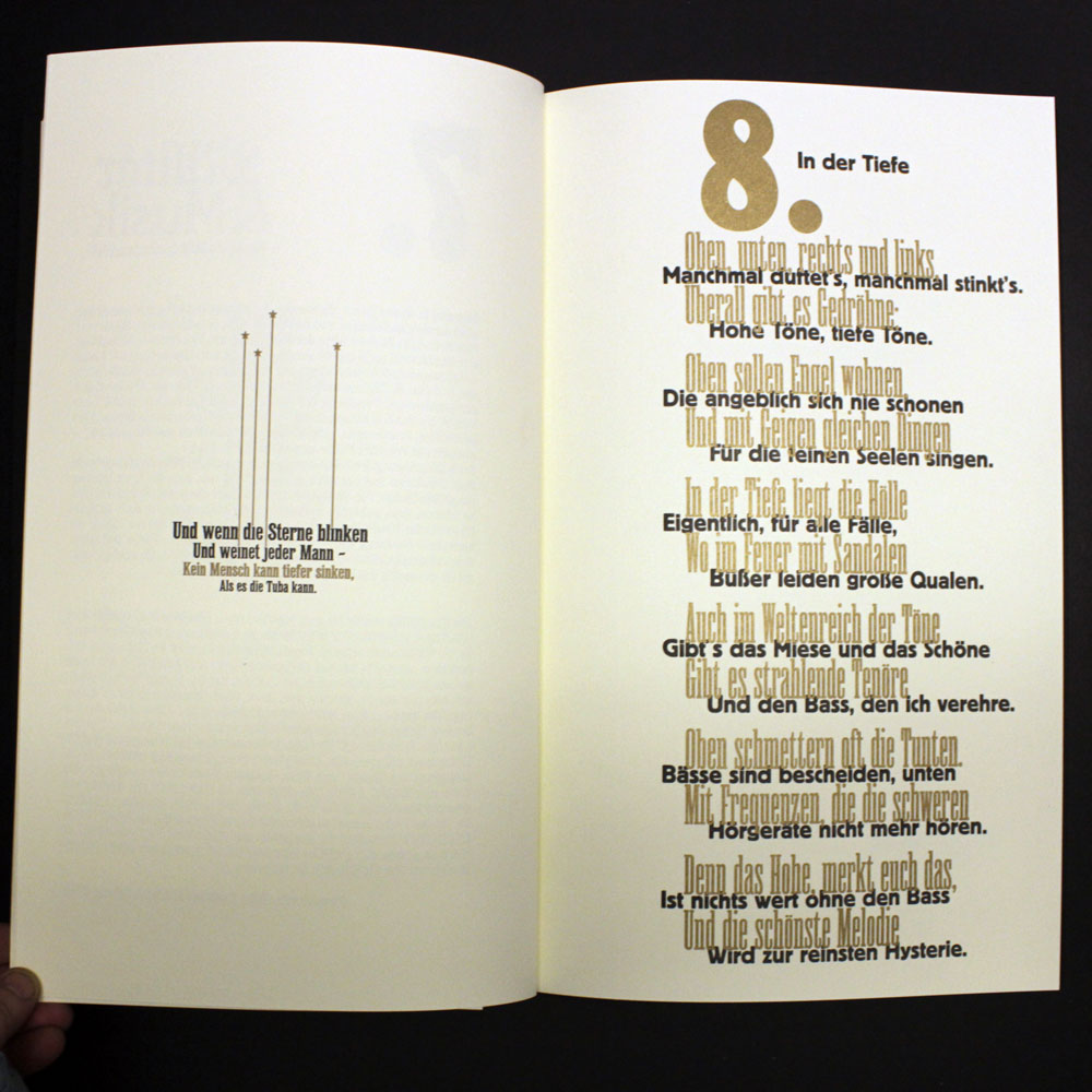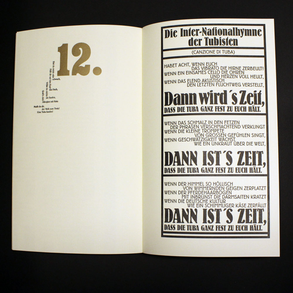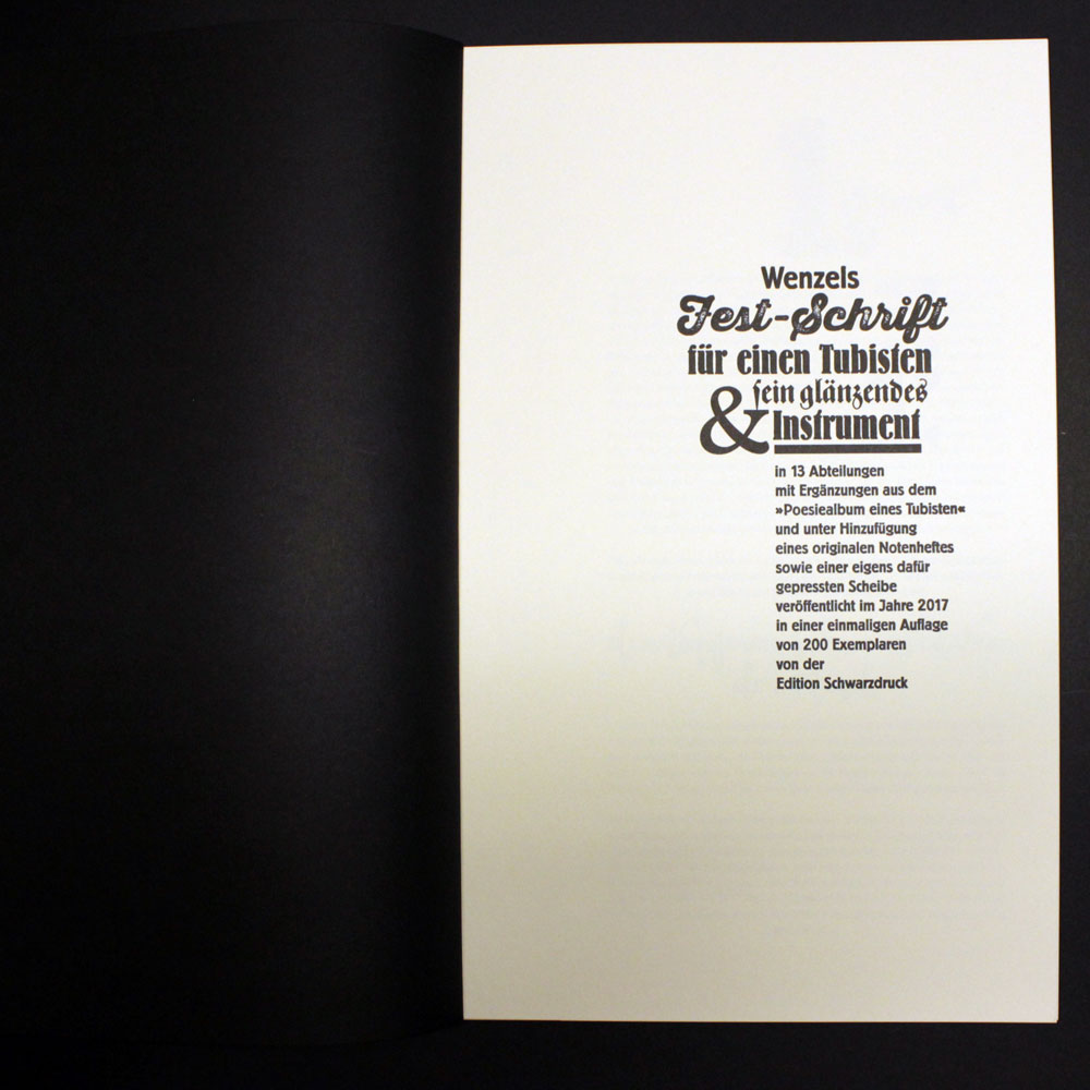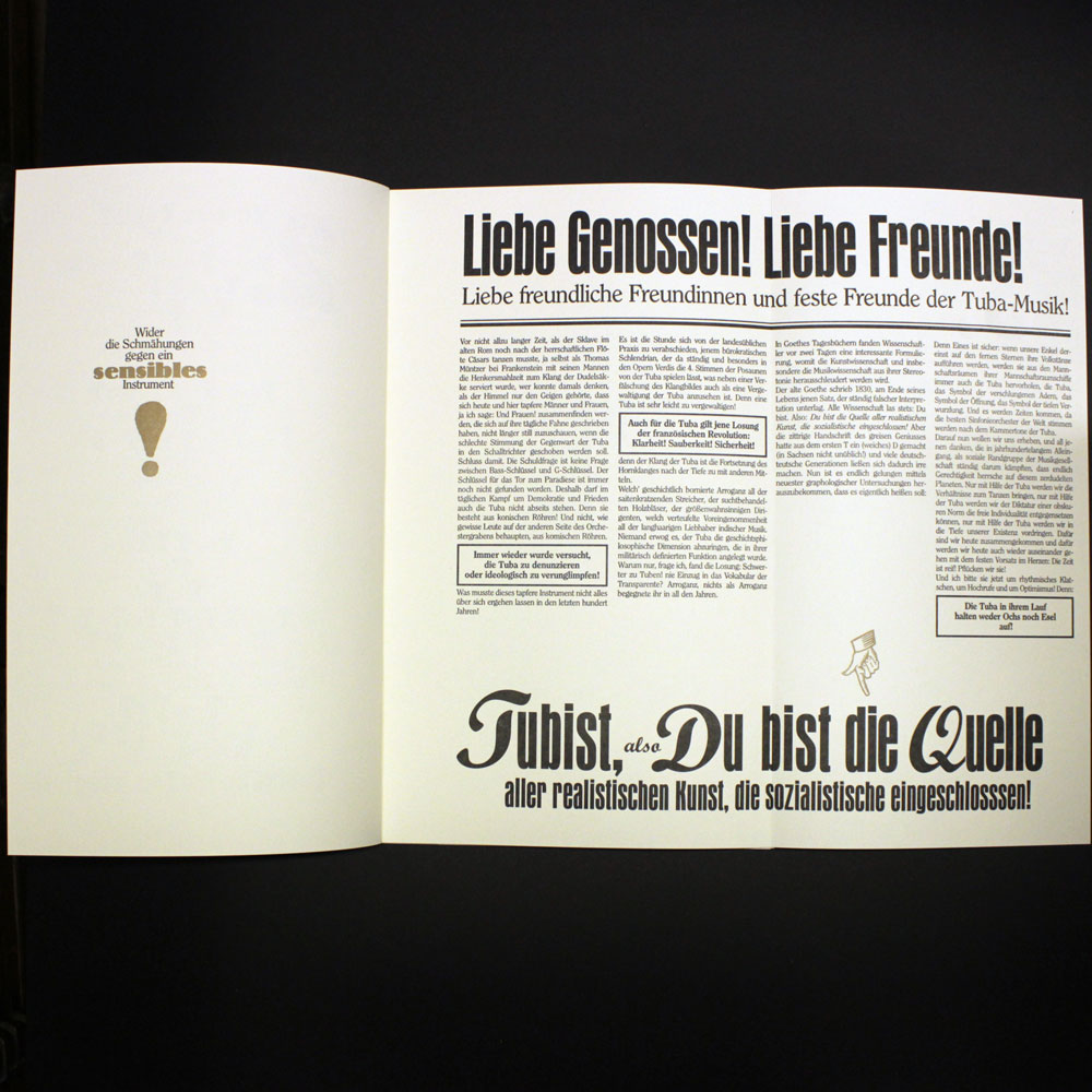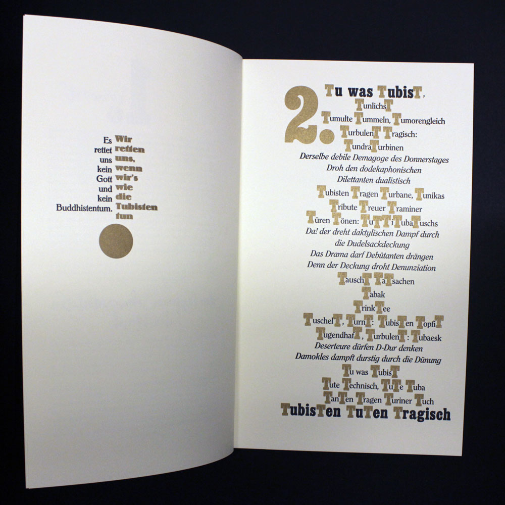 Zweifarbiger Buchdruck von Blei, Holz und Nyloprintplatten in schwarz und reichbleichgold auf 140g Poensgen&Heyer-Werkdruck. 14 Blätter, teilweise zum Ausklappen, mit vier Buchschrauben in einem schwarzen , zweifarbig (gold und silber) bedruckten Umschlag geheftet. Beiliegend eine eigens dafür produzierte exklusive CD mit historischen Aufnahmen von Tubamusik und ein dazu gehöriges Notenheft. Es wurden einmalig 200 Exemplare hergestellt, von denen maximal die 100 arabisch nummerierten Exemplare in den Verkauf gelangen.