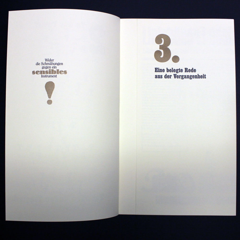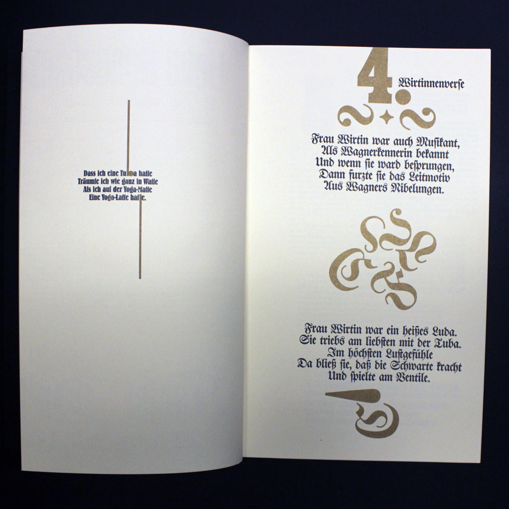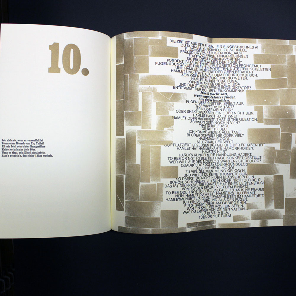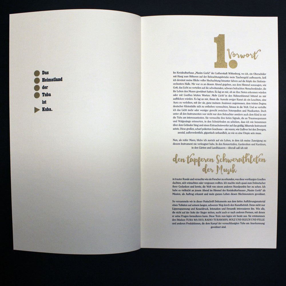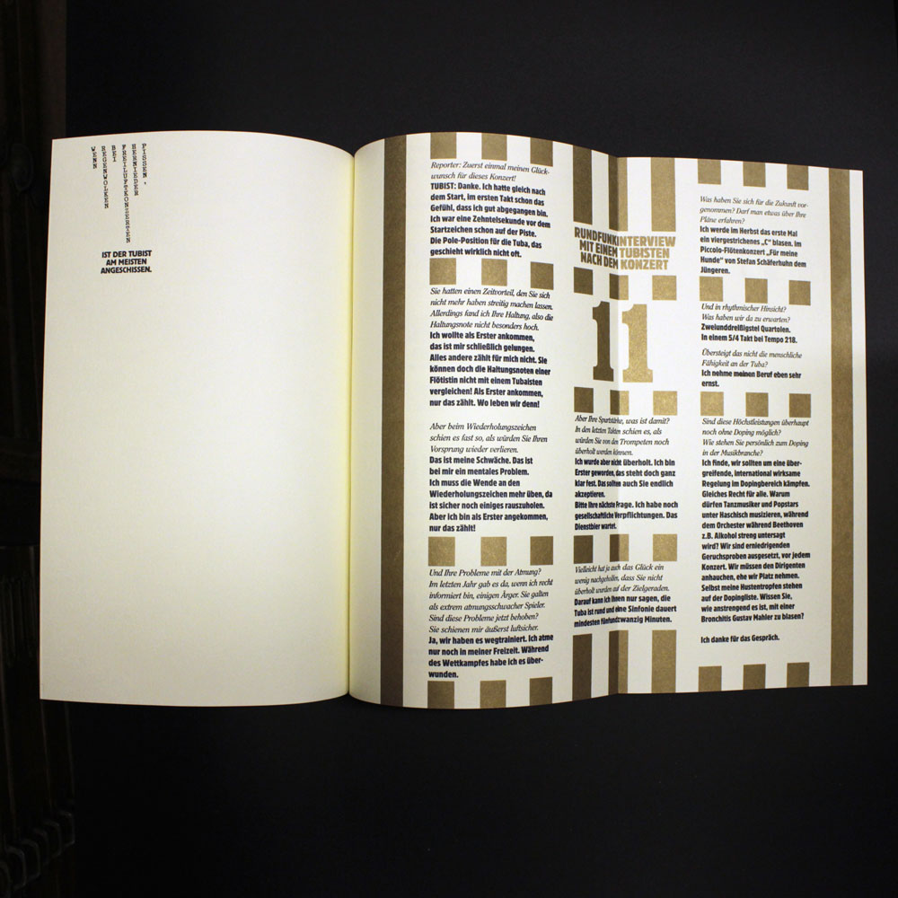 Zweifarbiger Buchdruck von Blei, Holz und Nyloprintplatten in schwarz und reichbleichgold auf 140g Poensgen&Heyer-Werkdruck. 14 Blätter, teilweise zum Ausklappen, mit vier Buchschrauben in einem schwarzen , zweifarbig (gold und silber) bedruckten Umschlag geheftet. Beiliegend eine eigens dafür produzierte exklusive CD mit historischen Aufnahmen von Tubamusik und ein dazu gehöriges Notenheft. Es wurden einmalig 200 Exemplare hergestellt, von denen maximal die 100 arabisch nummerierten Exemplare in den Verkauf gelangen.