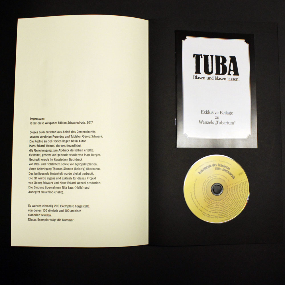 Schwarzdruck hat – endlich mal wieder! – einen neuen Handpressendruck herausgebracht. Das „Tubarium“ entstand anläßlich des Renteneintritts unseres Freundes und Tubisten Georg Schwark. Der spielt (bzw. nun spielte) nicht nur im Rundfunksinfonieorchester Berlin die Tuba, sondern auch in der Band von Hans Eckardt Wenzel. Dieser von uns hochverehrte Poet und Tausendsassa hat (quasi nebenbei!) im Lauf vieler Jahre immer wieder Texte über die Tuba und Tubisten geschrieben und damit vermutlich das weltweit umfangreichste und vielschcihtigste poetische Werk zu diesem Thema geschaffen. Nun endlich sind diese Texte auch in gedruckter Form für die Ewigkeit zu haben! Die Edition Schwarzdruck mit ihrem großen Herz für Unterdrückte und Benachteiligte hat viel Liebe und Arbeit in dieses Standardwerk für Freunde der Tubamusik gesteckt und sogar mit einer exklusiven Tubamusik-CD und einem dazugehörigen Notenheft zu einem einzigartigen Denkmal an dieses immer unterschätzte Instrument ihre Protagonisten gemacht. Aufgrund der zu erwartenden Nachfrage ist die einmalige Auflage auf 200 Exemplare limitiert, wovon allerdings nur maximal 100 Exemplare in den Verkauf gelangen.