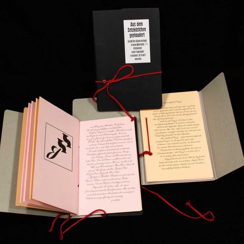 2010 • 26 Briefstücke (15 x 21 cm) in einer Mappe mit Kolumnenschnur geschnürt • Blei- und Computersatz • Buch- und Digitaldruck auf farbigen Kopierpapieren • Auflage: 222 numerierte Exemplare • 20 Euro • Nicht im Buchhandel – nur bei Edition Schwarzdruck direkt erhältlich!