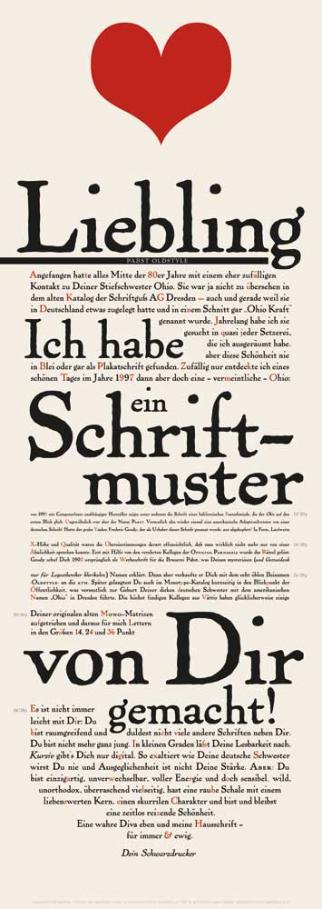 Da hatte der Veranstalter der Frauenfelder Buchmesse Beat Brechbühl die wunderbare Idee, anstelle der bis dahin üblichen Postkarten für ein Gemeinschaftsprojekt die Aussteller um ein Schriftmusterblatt ihrer Lieblingsschrift zu bitten. Was hätte das für eine interessante und schöne Ausstellung ergeben können. Aber leider waren die meisten der eingereichten Blätter nicht das, was der Schwarzdrucker erhofft hatte. Zu einem wirklich guten Schriftmuster gehört nach des Setzers Verständnis nämlich: die Abbildung aller vorhandenen Zeichen; eine Satzprobe in möglichst verschiedenen Schriftgrößen und Angaben zur Geschichte und Entstehung der Schrift. All das hat Eingang gefunden in diesen Liebesbrief an Schwarzdruckers Lieblingsschrift – die Ohio bzw. Pabst Oldstyle. Weil diese aber leider nicht in ausreichendem Maße in Blei in der Schwarzdruckwerkstatt vorhanden ist, musste das Ganze digital realisiert werden. Aber auch das kann ganz schön sein …