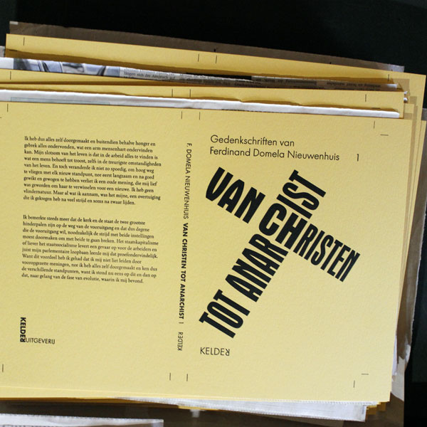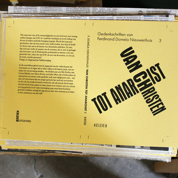 war endlich mal wieder in Betrieb. Gedruckt wurde für einen meiner liebsten Kunden die Umschläge für alle drei Bände eines Buches über einen berühmten holländischen Anarchisten. Zum einen deshalb bemerkenswert, weil das die Möglichkeit eröffnete, mal wieder etwas „Serielles“ zu machen: Das aus den Wörtern des Titels gebildete Kreuz kippt von Band 1 bis Band 3 immer mehr um und symbolisiert so die Wandlung vom Christen zum Anarchisten.