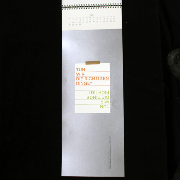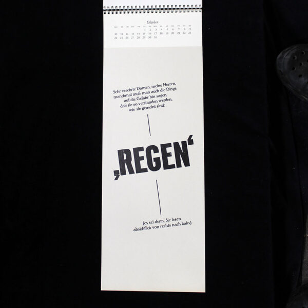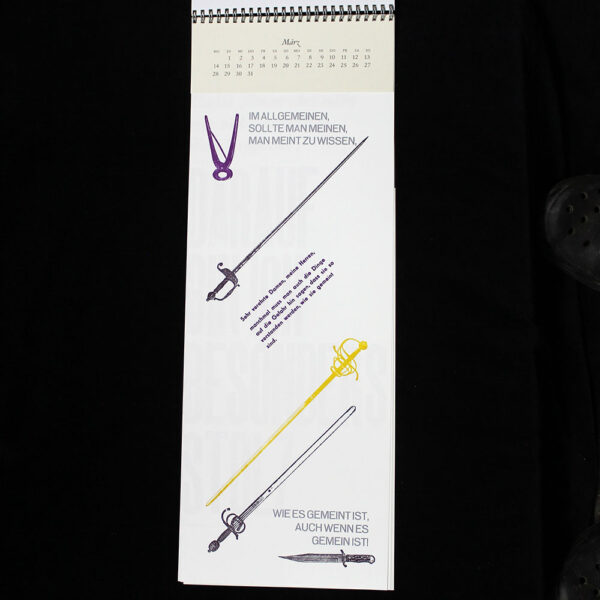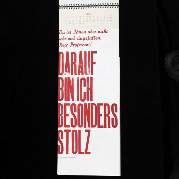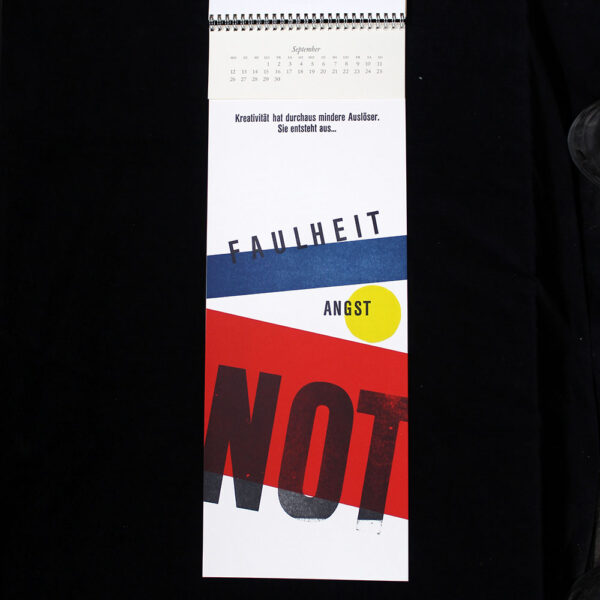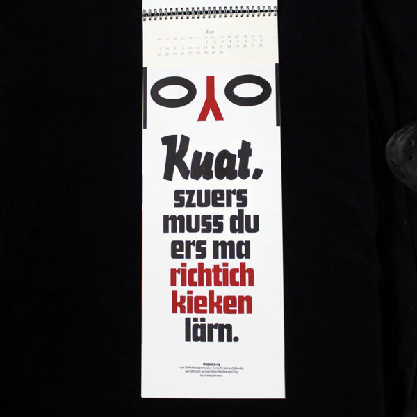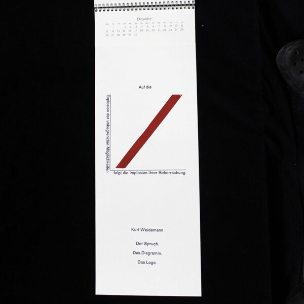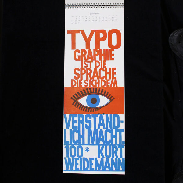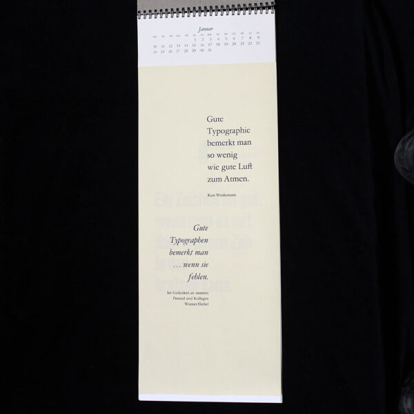 ‚); ?>Der Kalender ist zwar – wegen verschiedener innerbetrieblicher Schwierigkeiten im Krisenjahr – wieder recht spät, nun aber doch noch rechtzeitig fertig geworden. Thema ist diesmal der 100. Geburtstag von Kurt Weidemann. Kurt Weidemann war einer wichtigsten und einflußreichsten Graphikdesigner und Typografen der Bundesrepublik. Und auch wenn der Schwarzdrucker von den grafischen Arbeiten Kurt Weidemanns meist nicht so begeistert ist wie seine Fangemeinde: als Autor und Meister des geschliffenen Wortes ist Weidemann auch für Schwarzdruck einer der Größten. Es gab nicht viele Typografen, die die im Grunde simplen Prinzipien von guter Typografie dermaßen pointiert und zutreffend in Worte fassten. Und sich gelegentlich auch zu weniger speziellen Themen äußerten. Der (bisher) letzte dieser Heroen war Kurt Weidemann.