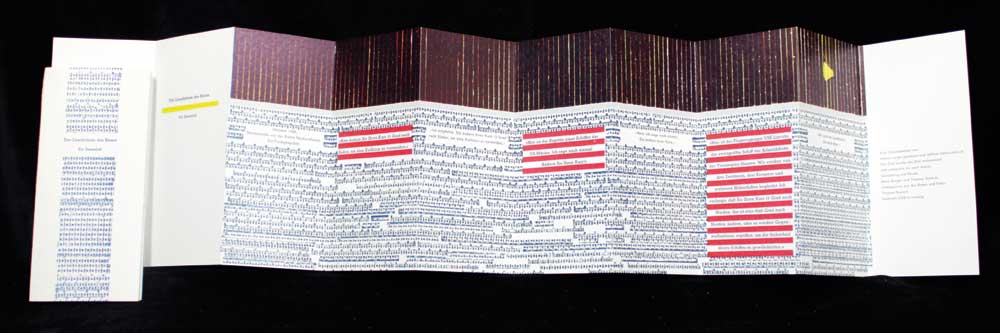 Kooperation mit „carpe plumbum“ Leipzig • 9x21cm • Auflage: 333 Exemplare • Leporello mit maschinennumerierten Schutzumschlag • Dreifarbiger Buchdruck auf der Schnellpresse „Präsident“ von Thomas Siemon in Leipzig • Linotypesatz (Schrift, Linien und umgedrehte Linozeilen)