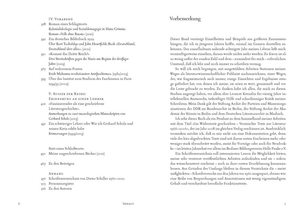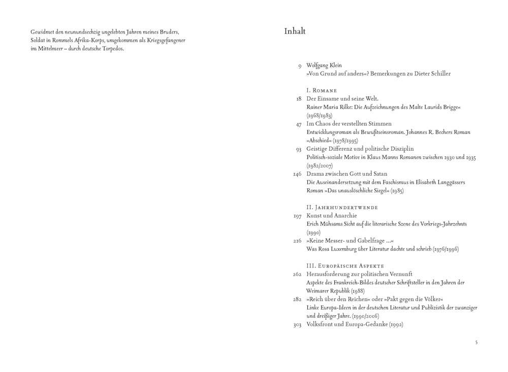 Der Literaturwissenschaftler Dieter Schiller beschreibt hier die sehr verschiedenen Ansätze zumeist linken Denkens und Dichtens in der ersten Hälfte des 20. Jahrhunderts. Arbeiten von Rainer Maria Rilke und Erich Mühsam, Johannes R. Becher und Elisabeth Langgässer, Hans Grimm und Klaus Mann und Kurt Tucholsky werden in einzelnen Aufsätzen in ihrer literarischen Substanz dargestellt und in das geistige Spektrum ihrer Zeit gestellt. Da geht es um Antifaschismus und Sozialdemagogie, Volksfront und Europa-Ideen. »Was Rosa Luxemburg über Literatur dachte und schrieb«, wird untersucht und dem Frankreich-Bild deutscher Schriftsteller während der Weimarer Republik nachgegangen. Die Aufsätze sind Teil eines Lebenswerks, das der Autor anläßlich seines 80. Geburtstags reflektiert. Manche Texte wurden noch einmal überarbeitet, viele so belassen, wie sie erschienen waren. Die Angaben über Entstehung und Veröffentlichungsgeschichte geben Auskunft über die jeweiligen kulturpolitischen Verhältnisse in der DDR, belegen Leistung, Entwicklung und Restriktionen. Das Vorwort schrieb Dieter Klein.