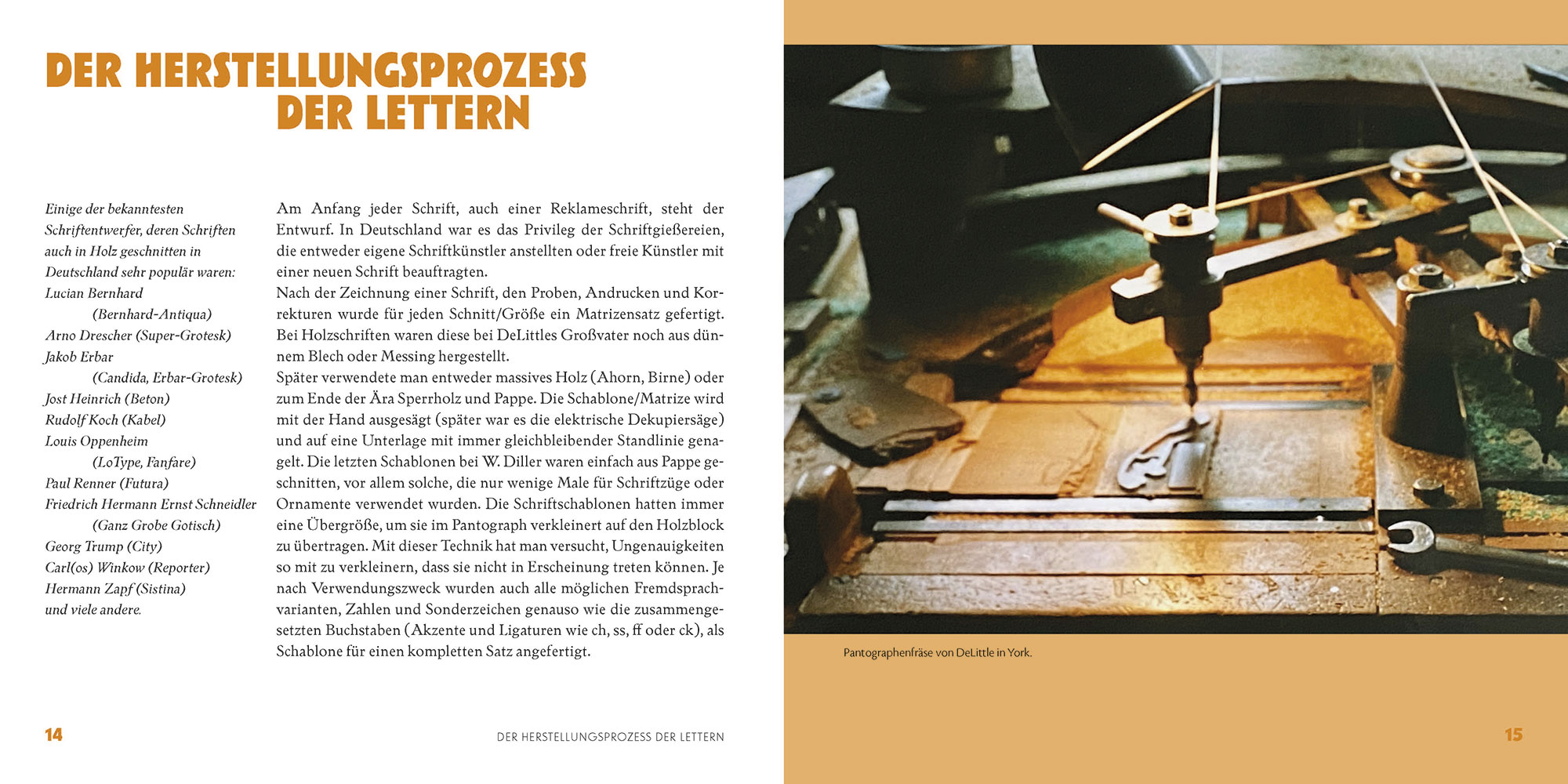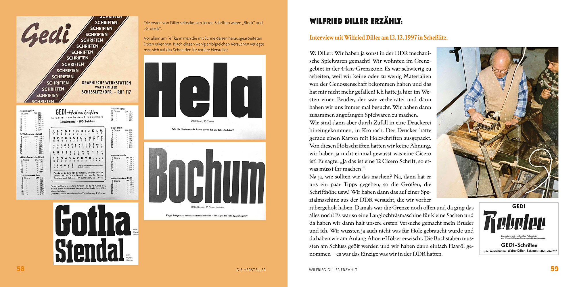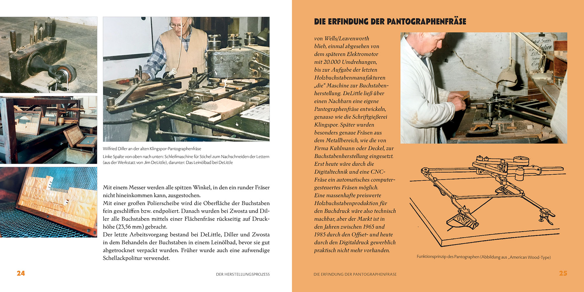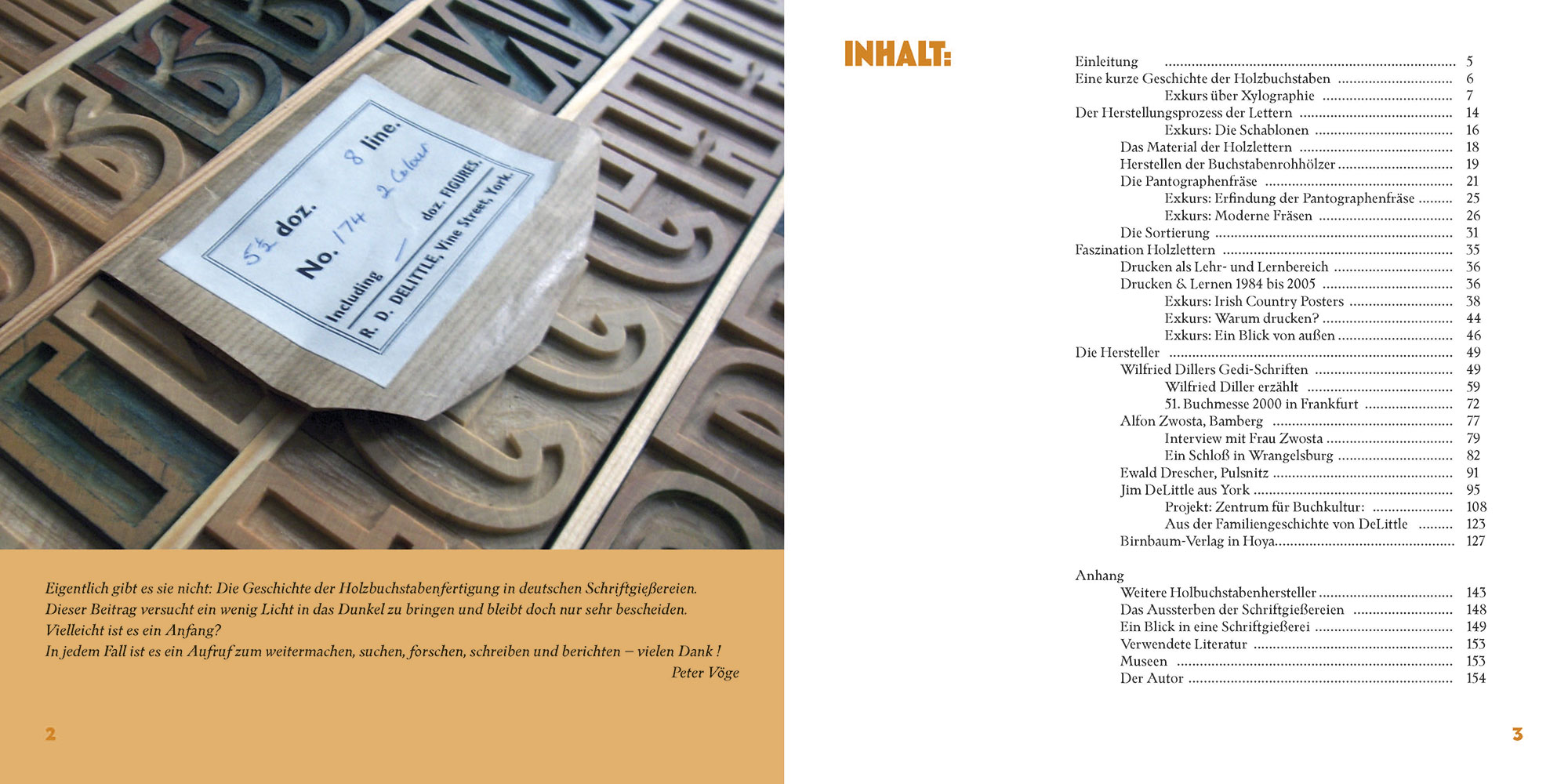 Neben einem kurzen Überblick über die Geschichte der Holzlettern und einem Einblick in die Technologie ihrer Herstellung werden die Holzschriftenhersteller Wilfried Diller, Alfons Zwosta, Ewald Drescher, Jim DeLittle und Michael Linke ausführlich vorgestellt. Angereichert werden diese teils sehr persönlichen Erinnerungen durch zahlreiche Abbildungen ihrer Schriftmuster.