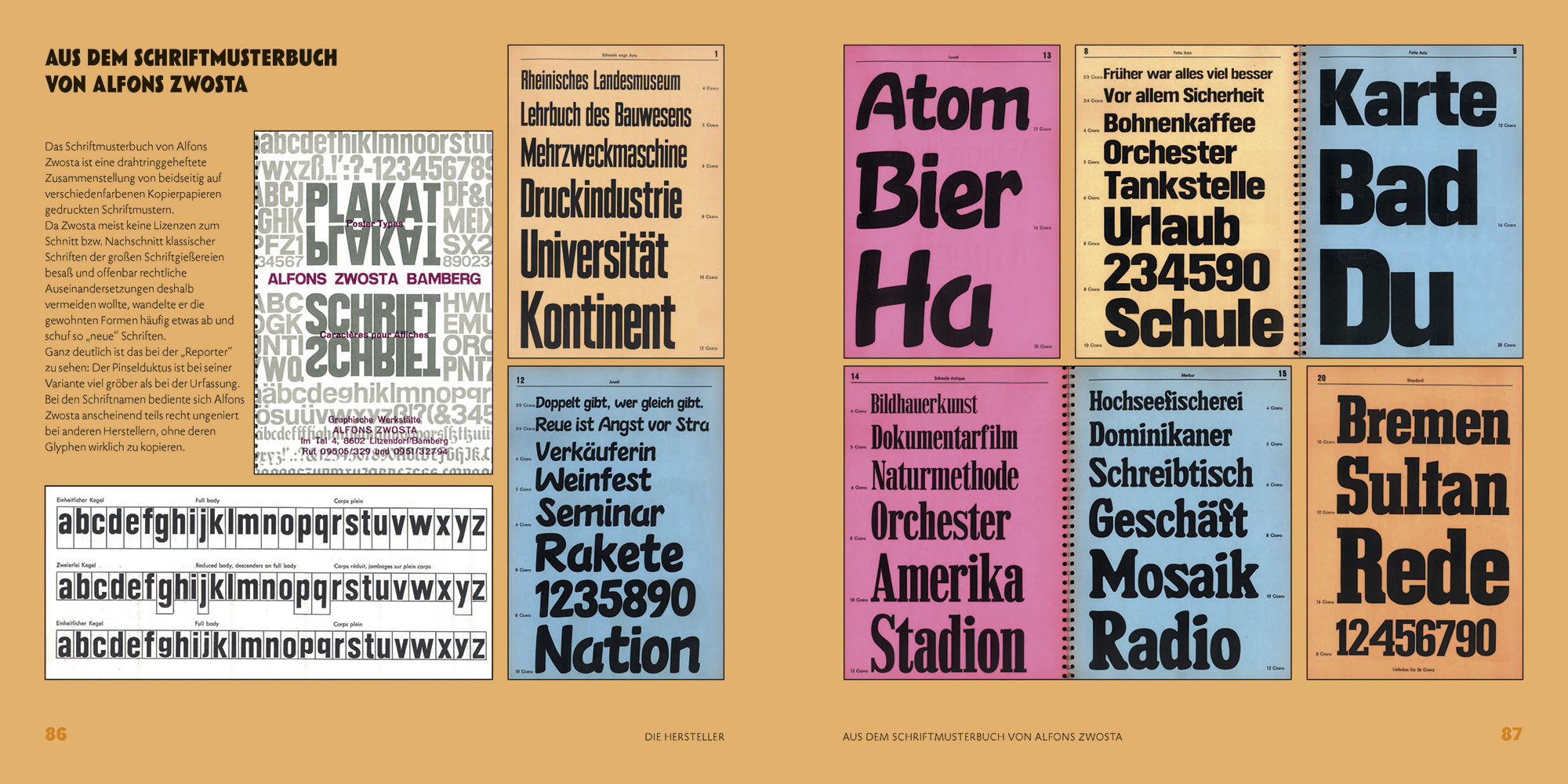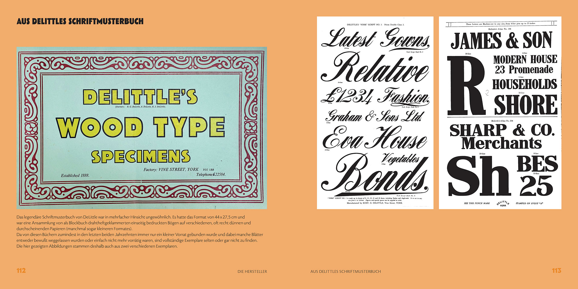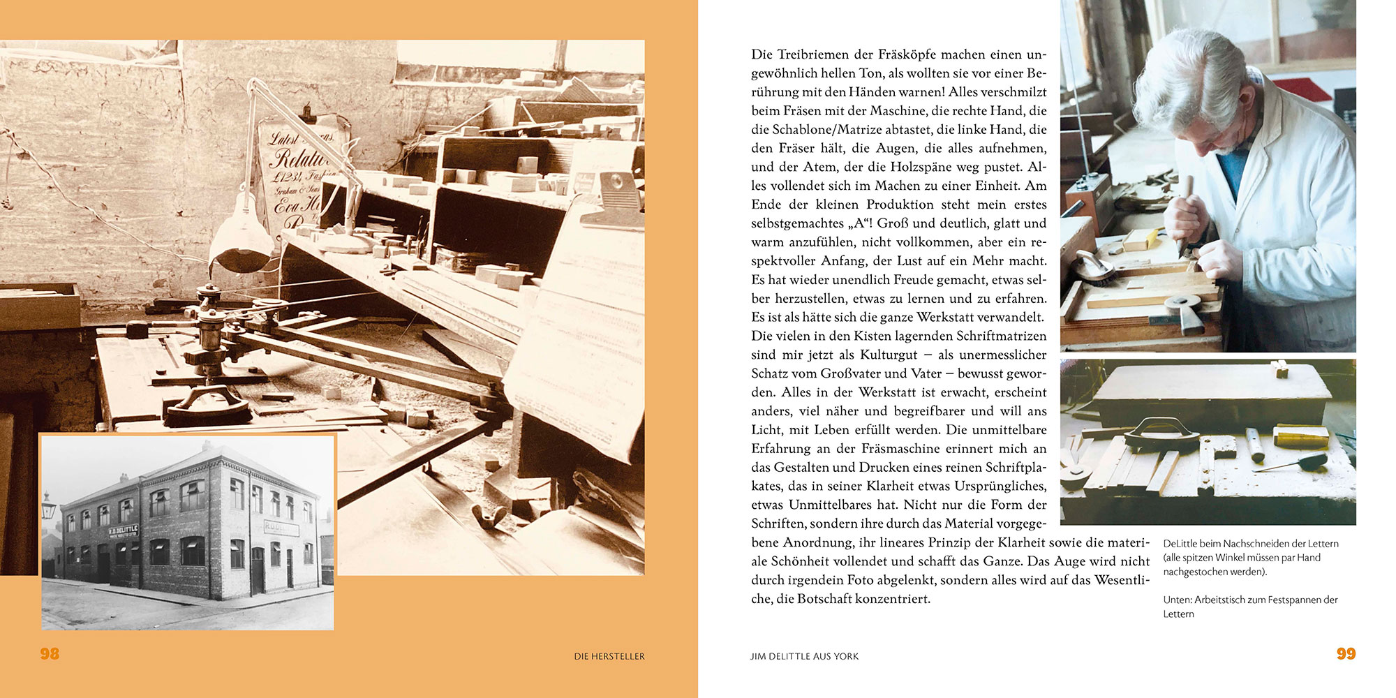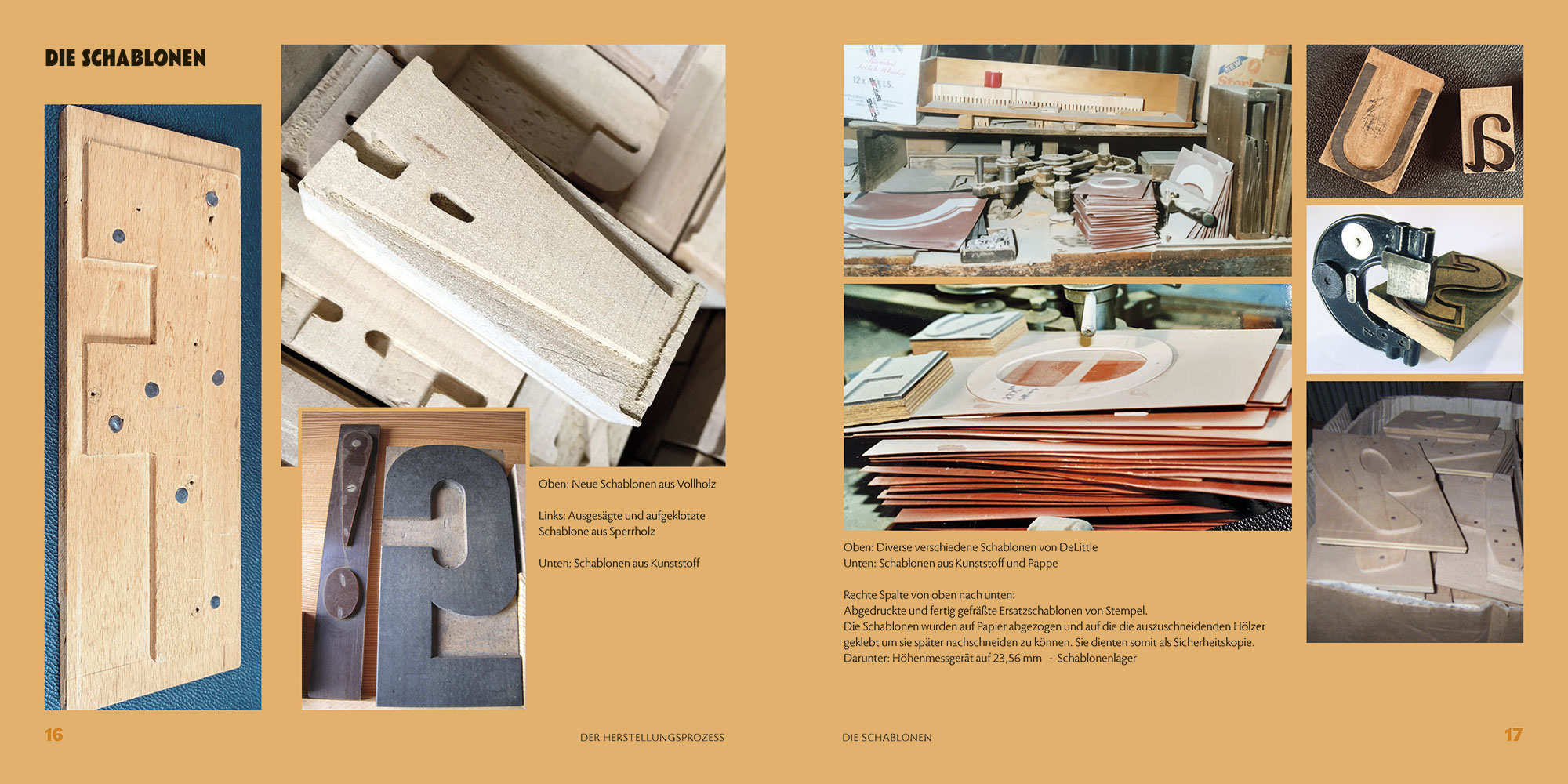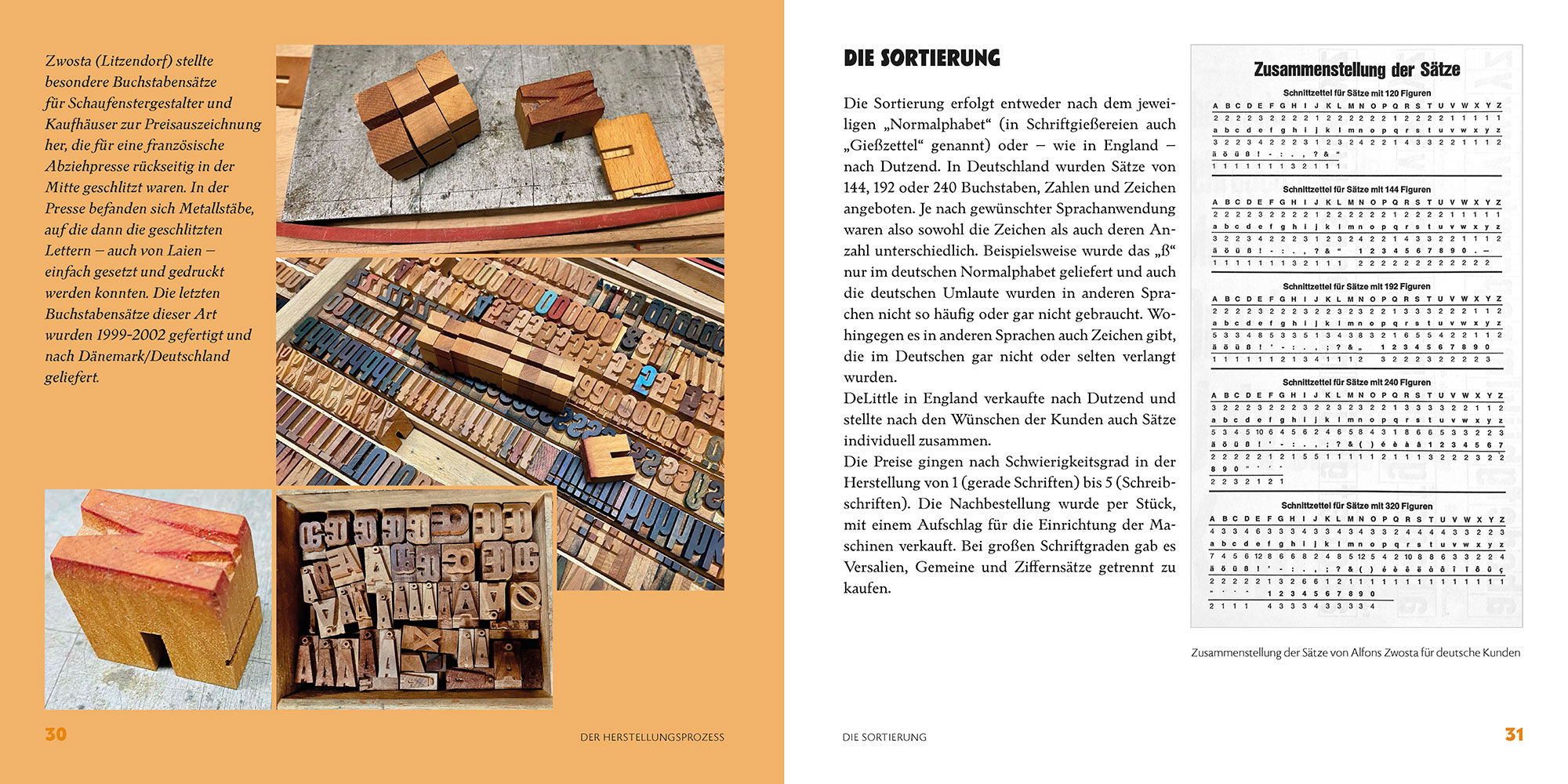 Neben einem kurzen Überblick über die Geschichte der Holzlettern und einem Einblick in die Technologie ihrer Herstellung werden die Holzschriftenhersteller Wilfried Diller, Alfons Zwosta, Ewald Drescher, Jim DeLittle und Michael Linke ausführlich vorgestellt. Angereichert werden diese teils sehr persönlichen Erinnerungen durch zahlreiche Abbildungen ihrer Schriftmuster.