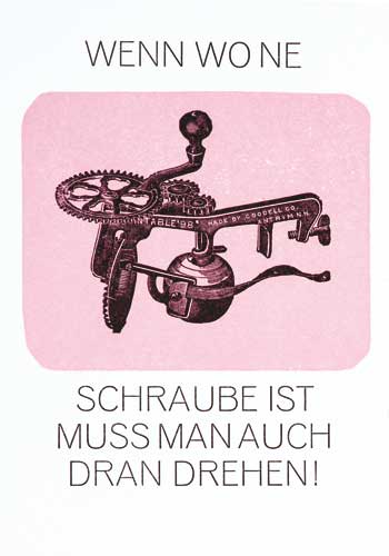 Diese Postkartenserie mit 9 Motiven entstand – sehr spontan – als Dankeschön für die Crowdfounding-Kampagne zur Finanzierung des Kataloges zur Ausstellung „DADA ist 100“. Gedruckt wurde auf dem Heidelberger Tiegel, handgesetzt aus diversen Bleisatzlettern und Typoelementen unter Verwendung zweier alter Klischees und eines Stückchens Linoleum für die Hintergründe. Gedruckt wurden jeweils so etwa 200 Exemplare, es können bei dem einen oder anderen Motiv auch ein paar mehr oder weniger geworden sein. Format: 15 x 21 cm, Papier: Kartonreste.