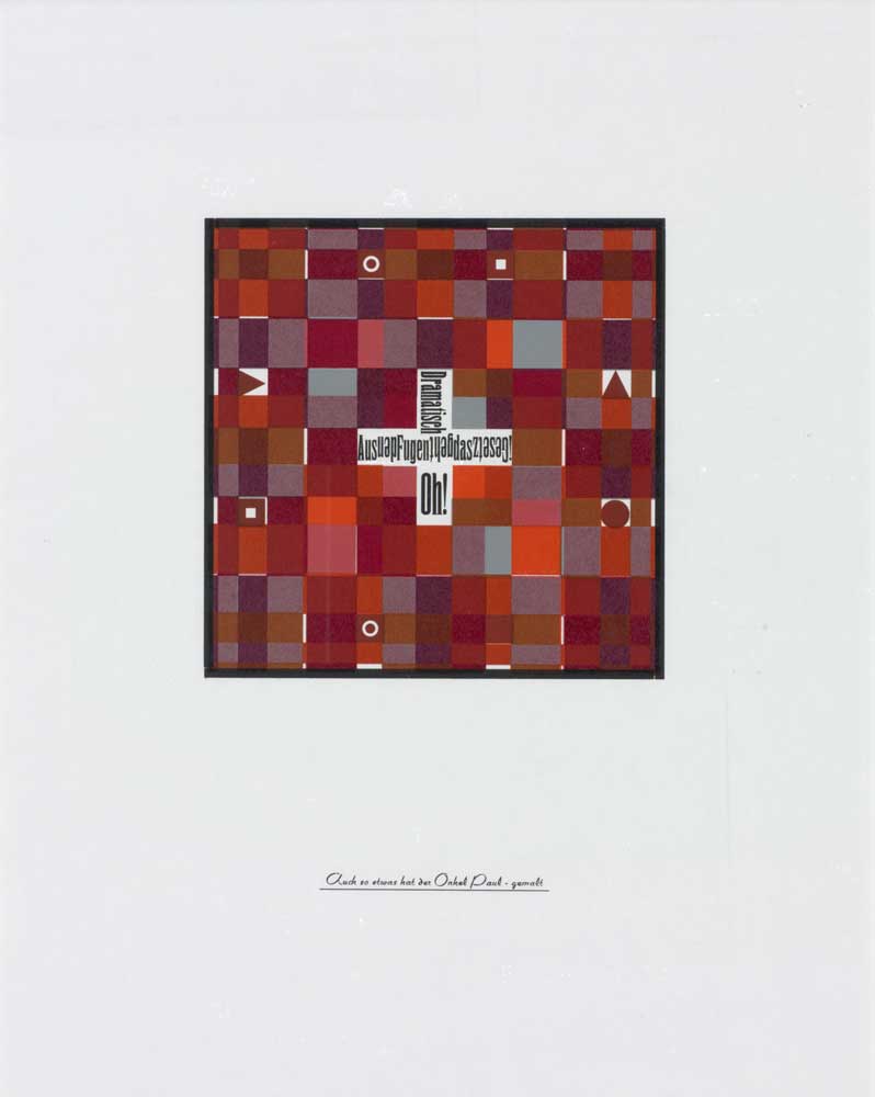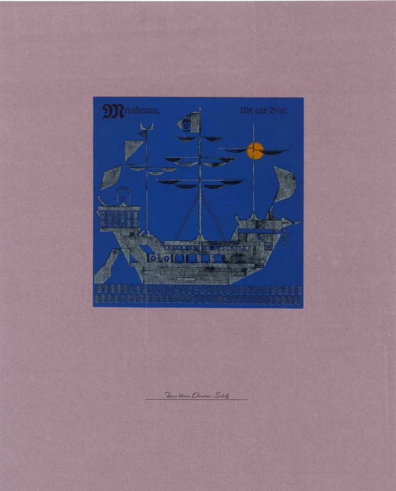 Das Blatt »Das kleine Piraten-Schiff« entstand eigentlich nur als Einblattdruck für eine Ausstellung »Hommage á …«. Weil sich aber bei der Recherche so viele wunderschöne Gedichte von Paul Klee anfanden, ist dann doch eine ganze Mappe (7 Blätter und Titelblatt) mit dem Titel »Der Witz hat über den Geist gesiegt« entstanden. Verwendet wurden Materialien und Schriften aus dem Setzkasten, verschiedene Wellpappen und Kolumnenschnur. Gedruckt wurde mehrfarbig im Hochdruck auf der Grafix-Andruckpresse. Das Originalformat der Blätter ist 40 x 60cm. Die Auflage betrug 20 Exemplare.